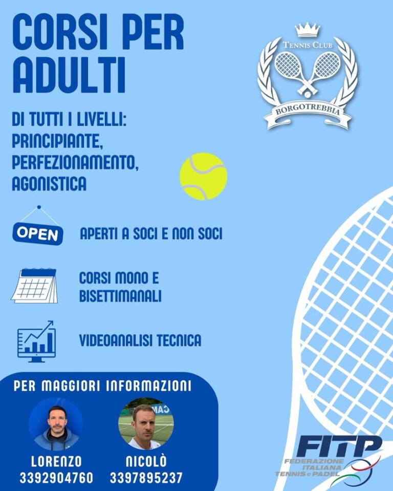 🏸 **Corso di Tennis per Adulti al Tennis Club Borgotrebbia!** 🎾 Siamo entusiasti di annunciare l’apertura dei corsi di tennis per adulti, adatti a tutti