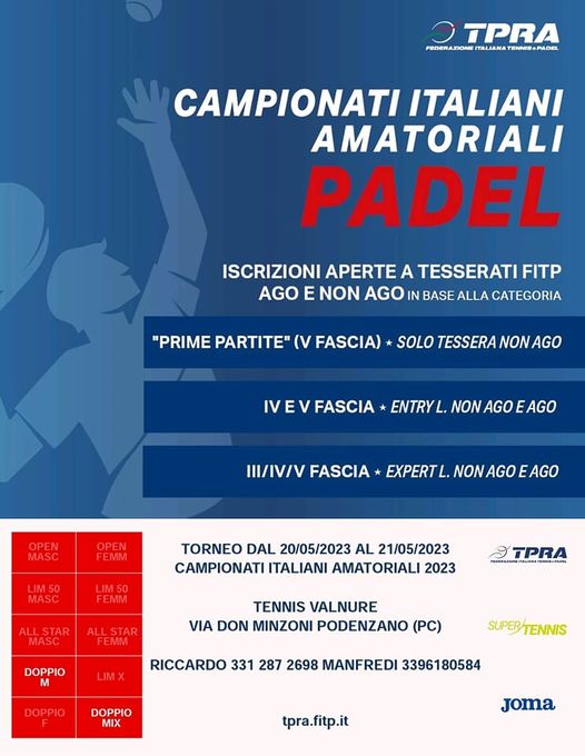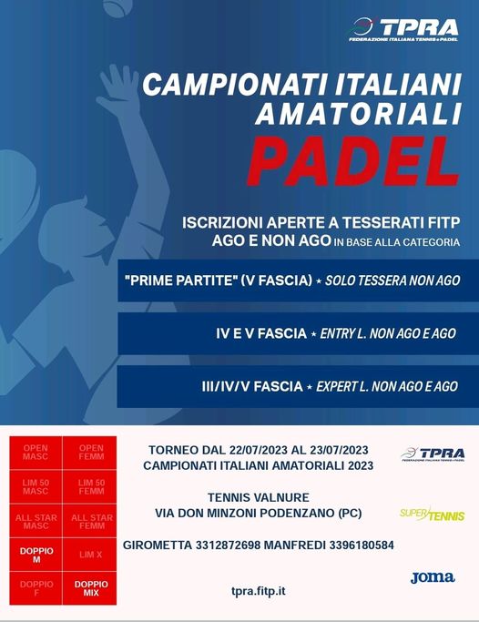 https://tpra.fitp.it/ITA/altro/Scheda_torneo.fit?IdTorneo=105389 Tappa Tpra del CAMPIONATO ITALIANO AMATORIALE in programma domenica 23 luglio! Forza con le iscrizioni! X i meglio classificati nel torneo ci sarà quindi