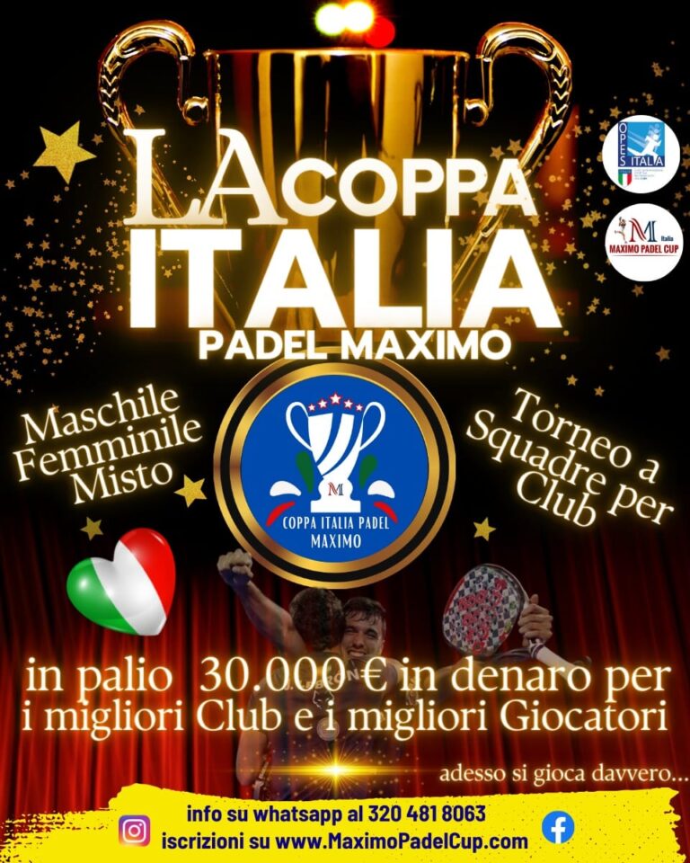 Aperte le iscrizioni alla *COPPA ITALIA PADEL MAXIMO A SQUADRE* 🏆 *Torneo Nazionale rivolto a tutti i PADEL CLUB di ogni Regione Italiana* 💪 💰