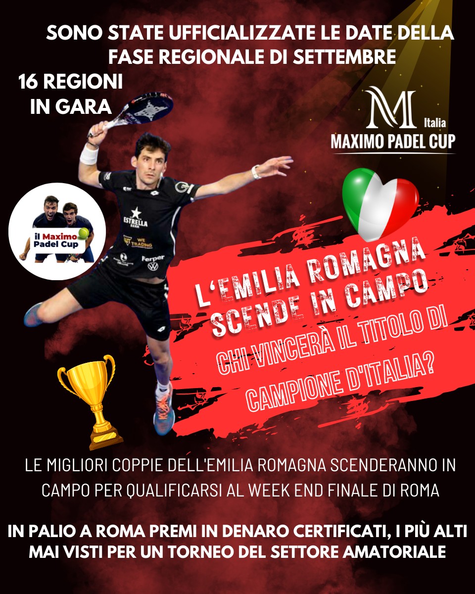 16 Regioni presenti, chi Vincerà il Titolo di Campione d’Italia? 🥰 Il Master Finale del 🏆MAXIMO PADEL CUP🏆 Sono state Ufficializzate le date della Fase Regionale di Settembre fino alle Finalissime di Roma🤩 🔥 l’EMILIA ROMAGNA Scende in Campo 💪 Le Migliori Coppie della Regione si sfideranno per qualificarsi al week end finale di Roma dove in palio ci saranno premi in denaro certificati, i più alti mai visti in un Torneo di Padel del Settore Amatoriale 16 Regioni presenti, chi Vincerà il Titolo di Campione d’Italia? Un Grazie Speciale ai nostri Partners Organizzativi: