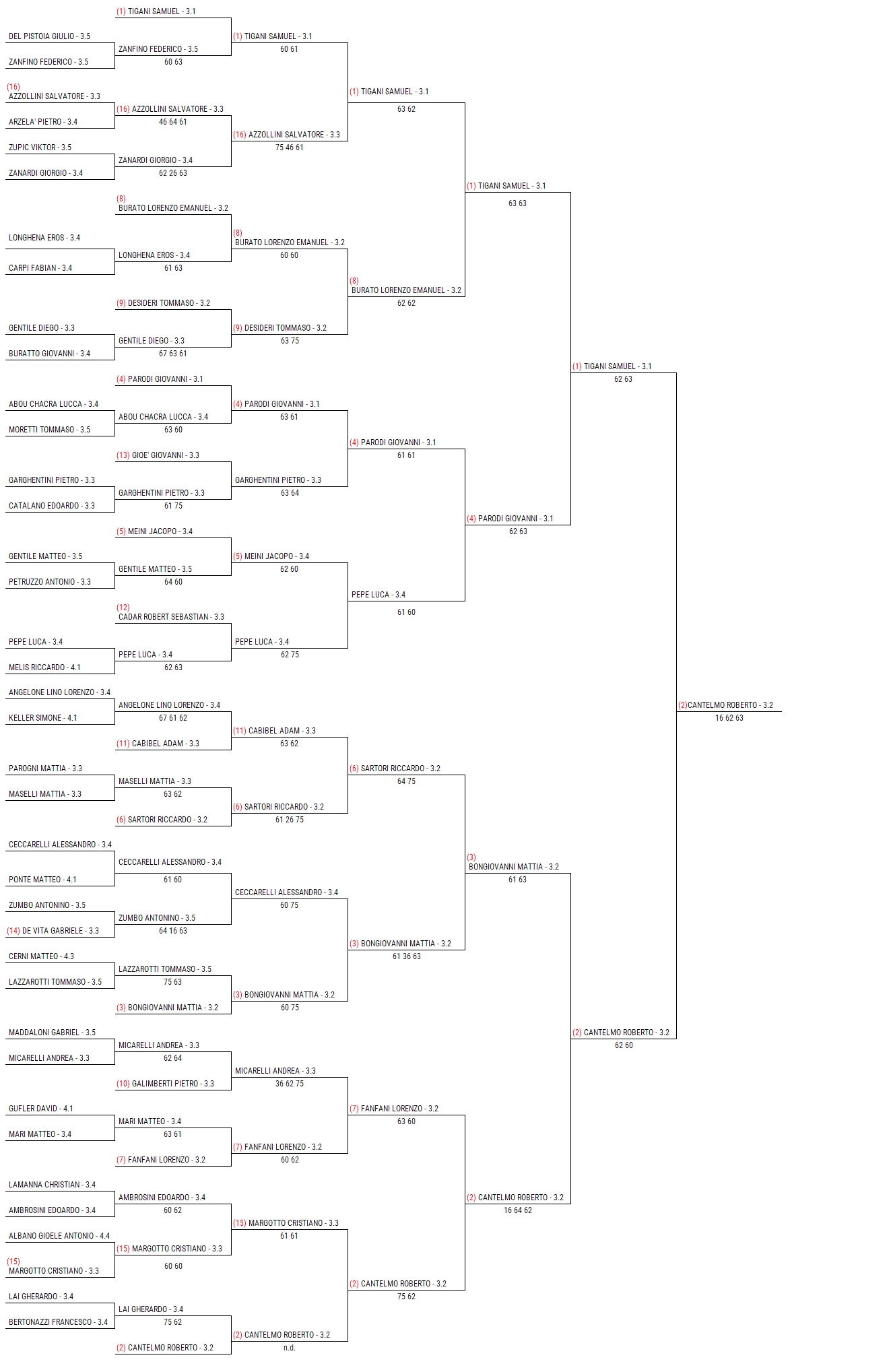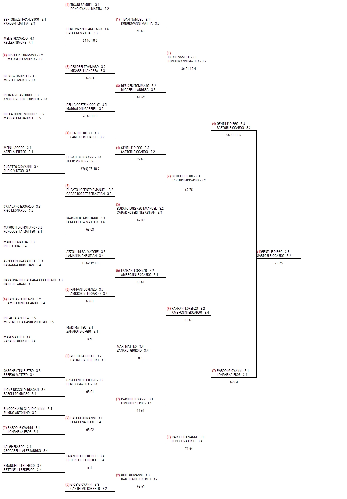 In coppia con Diego Gentile del Ten Sport Center di Cervia, Sartori ha mostrato determinazione e carattere, superando turno dopo turno avversari di alto livello. La vittoria più significativa è arrivata in semifinale contro la coppia numero uno del seeding, battuta al super tie-break dopo una partita combattutissima. In finale i due giovani hanno completato l’opera imponendosi in due set molto equilibrati contro la coppia testa di serie numero 7 formata da Giovanni Parodi (3.1) ed Eros Longhena (3.4) battuta per 7-5 7-5.