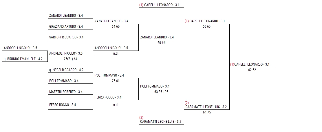 Nella finale maschile Under 16, il cremonese Leonardo Capelli (3.1) ha battuto Leone Luis Caramatti (3.2) con un convincente 6/2 6/2. Capelli ha messo in mostra una solida tecnica e un’eccellente strategia di gioco, non lasciando spazio a Caramatti per tentare una rimonta.