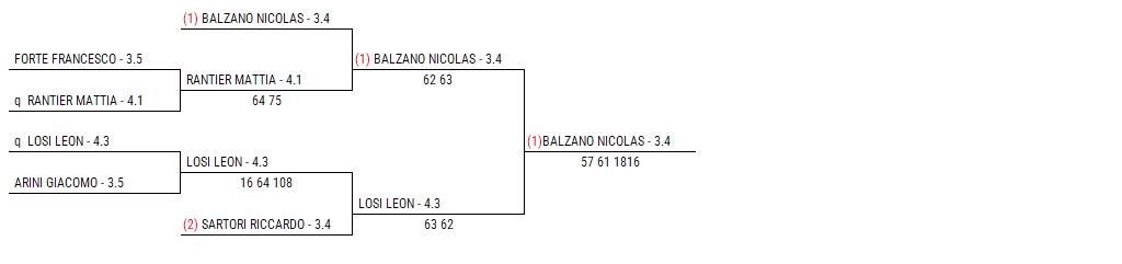 La finale maschile Under 14 ha visto opposti Nicolas Balzano (classifica 3.4) e Leon Losi (4.3) in un match molto intenso. Balzano ha avuto la meglio su Losi con il punteggio di 5/7 6/1 18/16, dimostrando grande resistenza e capacità di recupero. Leon Losi, nonostante la sconfitta, ha giocato un ottimo torneo. Prima, ha superato Giacomo Arini (3.5) con un combattuto 10/8 al super tiebreak e ha poi eliminato Riccardo Sartori (3.4), giovanissimo under 12 ma già testa di serie numero 2, per 6/3 6/2.